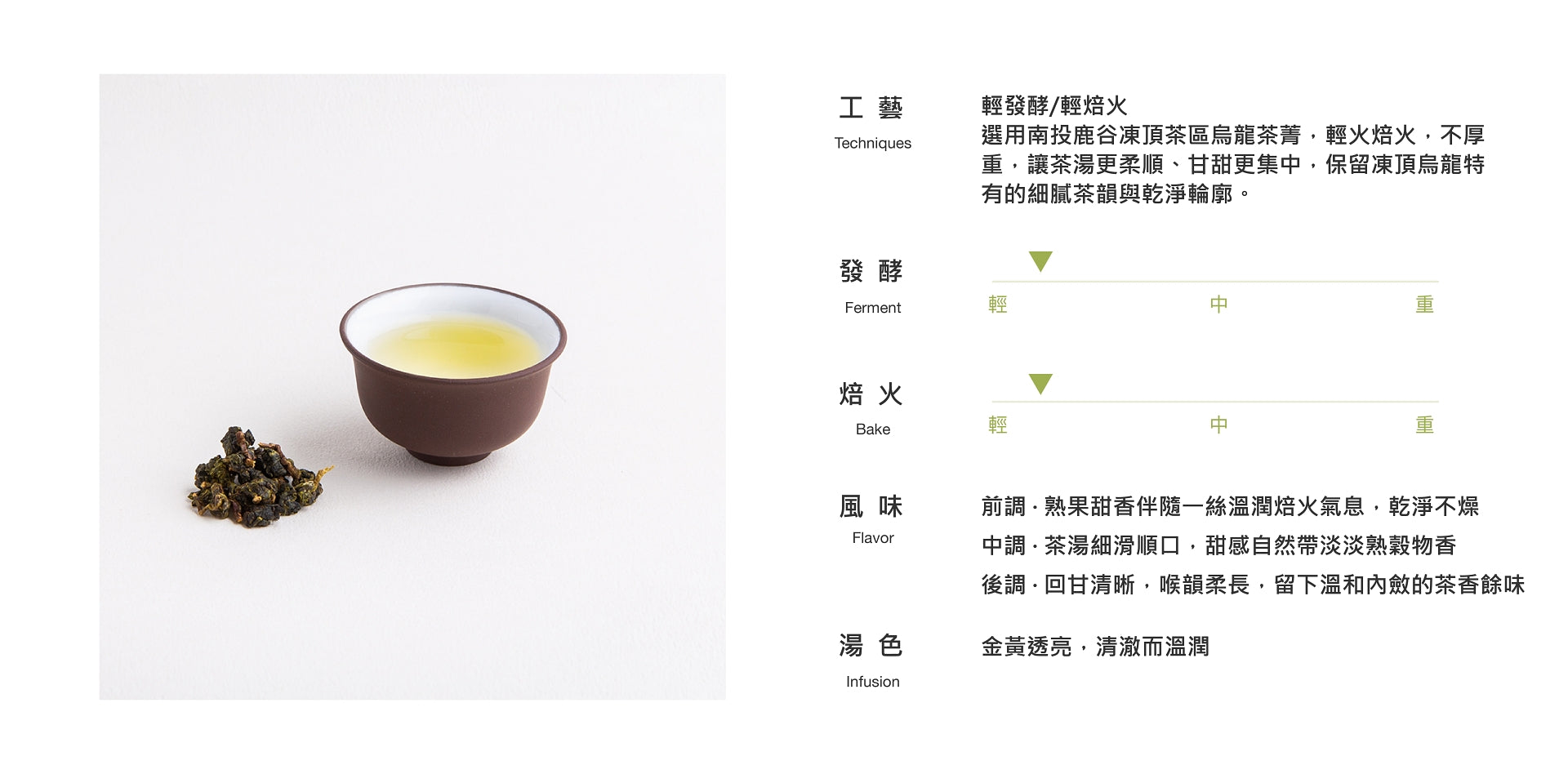 這款凍頂烏龍嚴選自台灣優質茶區,承襲傳統製茶工藝,經中度發酵與精緻烘焙而成。